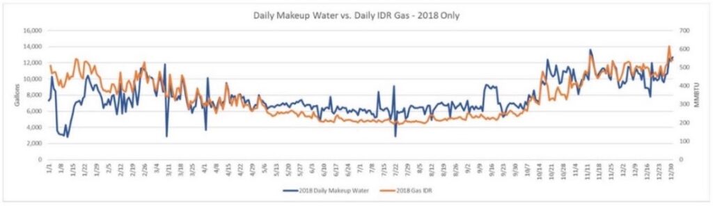 When managing utilities, it’s important to understand how changes will affect your total utility cost. We analyzed data across a large organization to find the correlation between water and gas usage. Specifically, an increase in makeup water leads to increased natural gas usage.